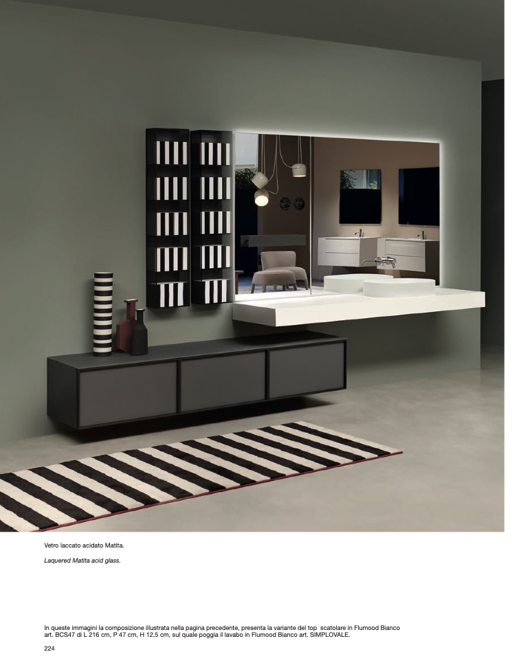 art. BCS47 di L 216 cm, P 47 cm, H 12,5 cm, sul quale poggia il lavabo in Flumood Bianco art. SIMPLOVALE.
