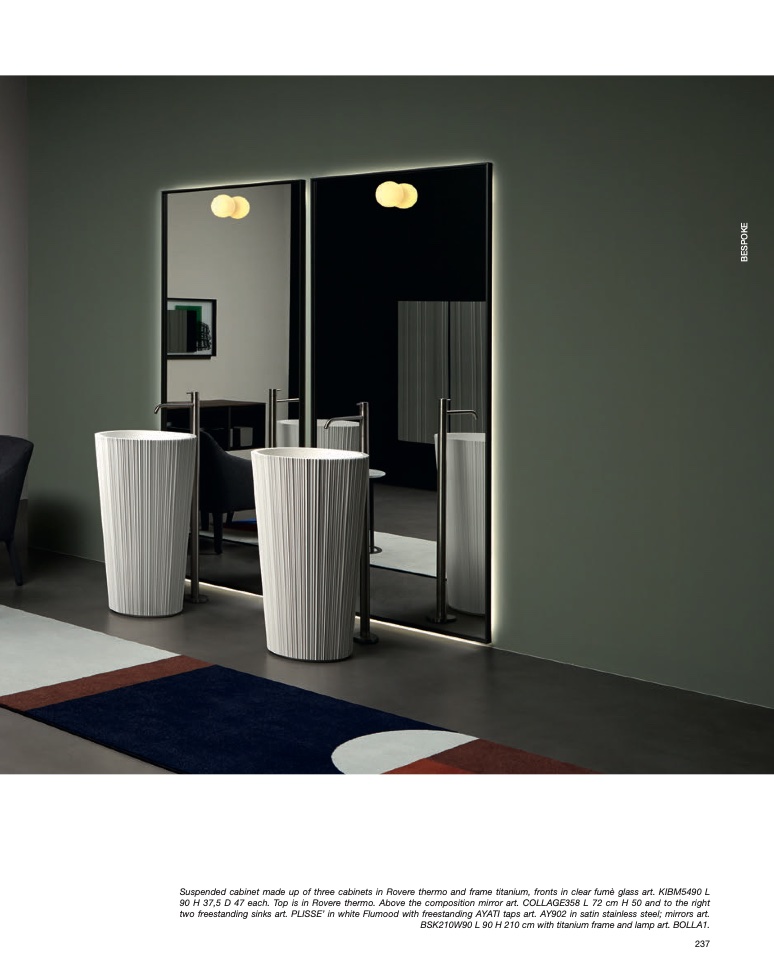 two freestanding sinks art. PLISSE’ in white Flumood with freestanding AYATI taps art. AY902 in satin stainless steel; mirrors art.