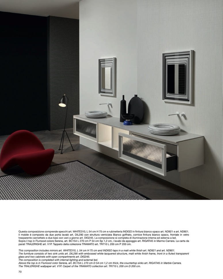 The furniture consists of two sink units art. DIL290 with embossed white lacquered structure, matt white