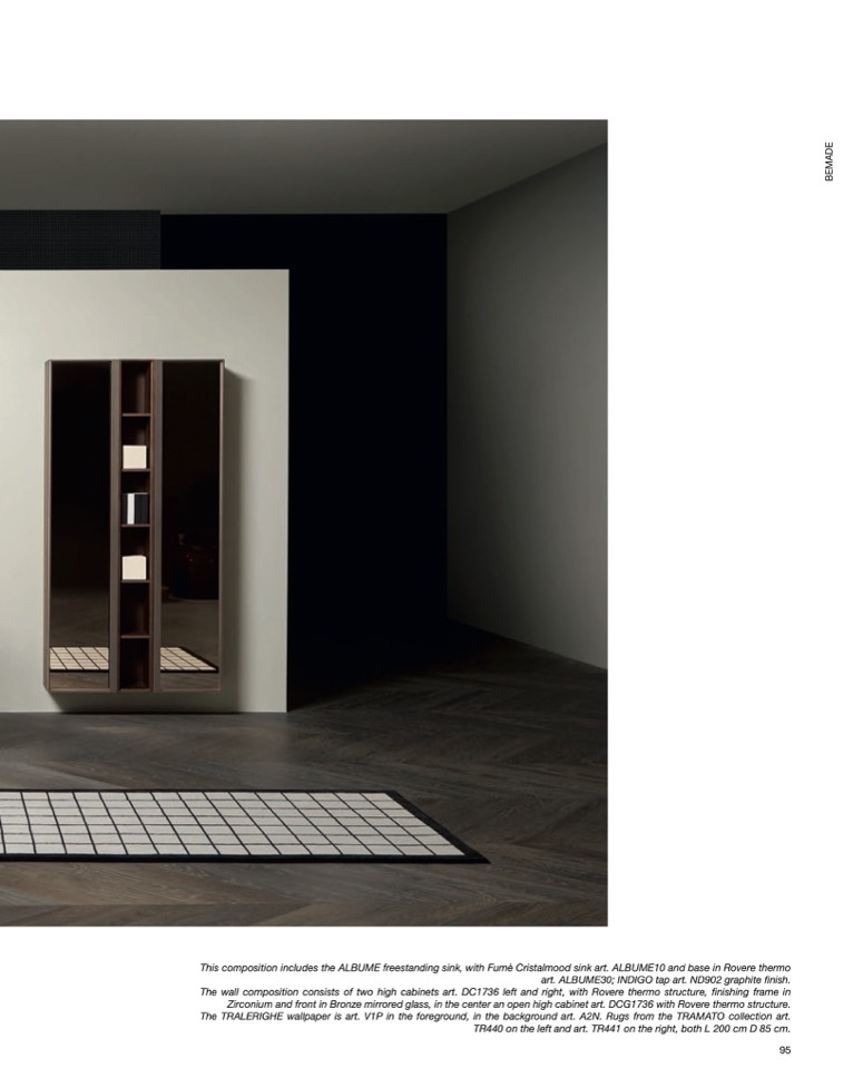 This composition includes the ALBUME freestanding sink, with Fumè Cristalmood sink art. ALBUME10 and base in Rovere thermo
