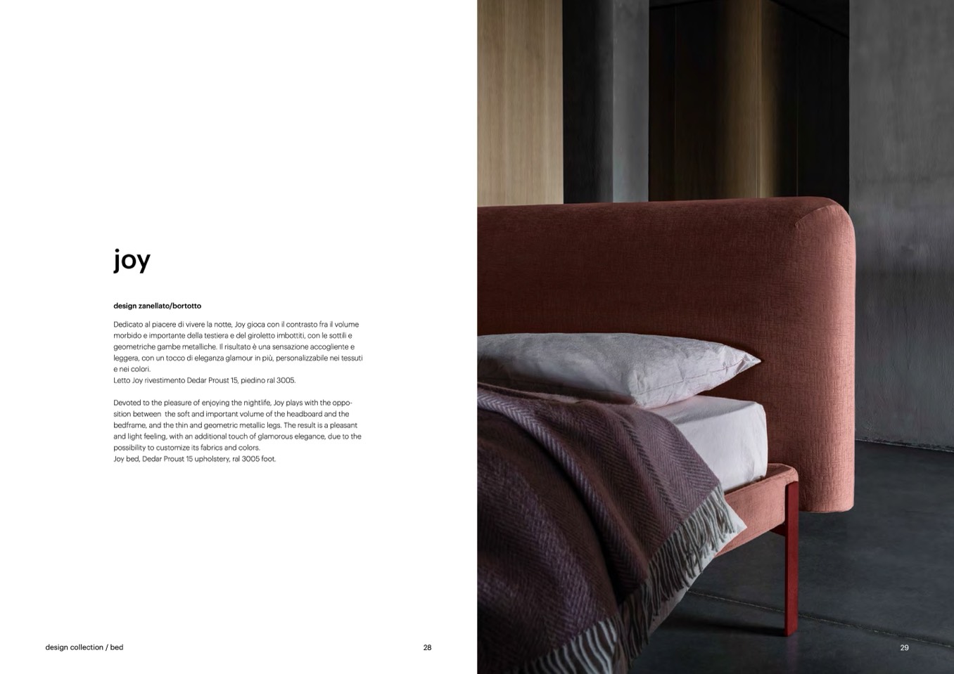Joy bed, Dedar Proust 15 upholstery, ral 3005 foot.