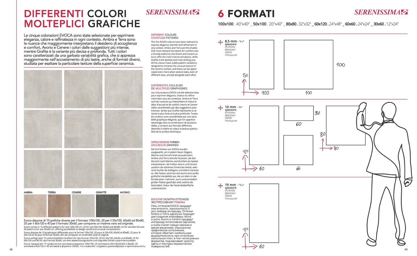 Evoca comes in 10 different patterns for size 100x100 cm, 20 for size 50x100, 60x60 and 80x80, 25 for size 60x120 and