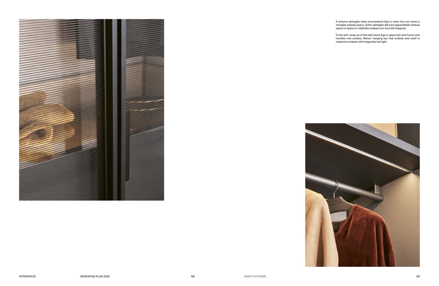 A sinistra: dettaglio delle ante battenti Ego in vetro line con telaio e