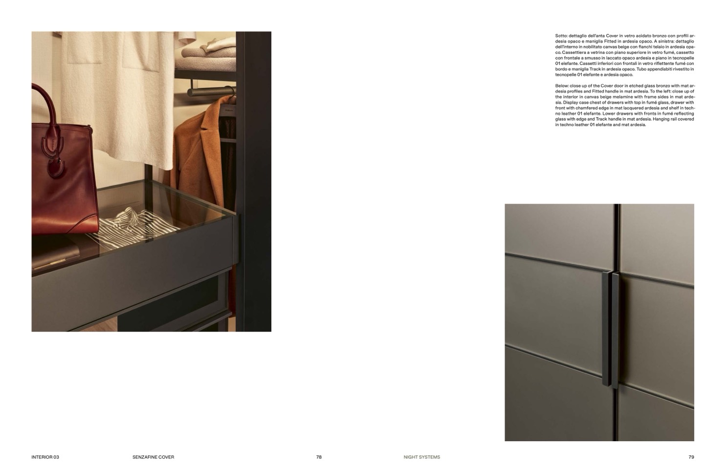 Sotto: dettaglio dell’anta Cover in vetro acidato bronzo con profili ar-