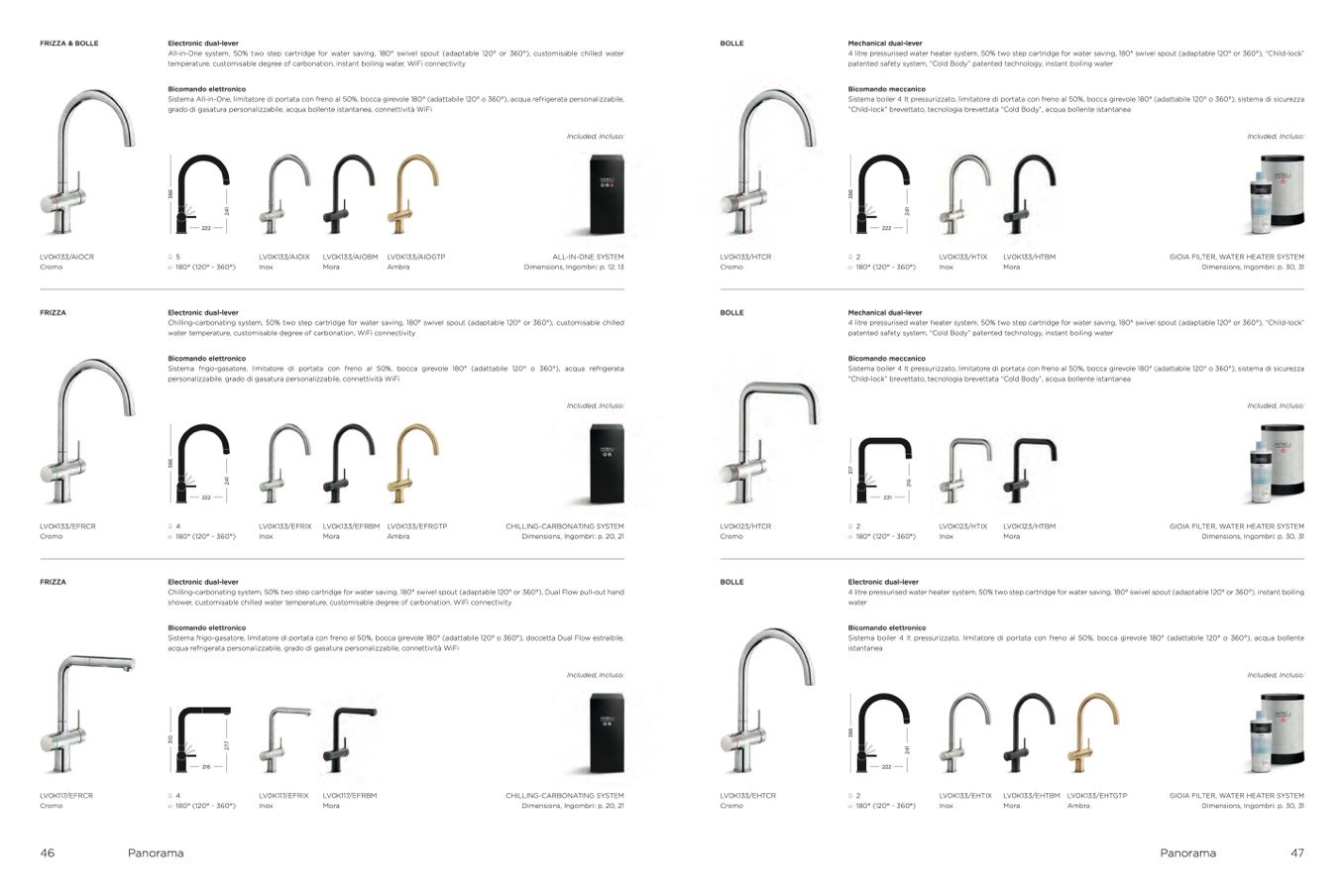 All-in-One system, 50% two step cartridge for water saving, 180° swivel spout (adaptable 120° or 360°), customisable chilled wate