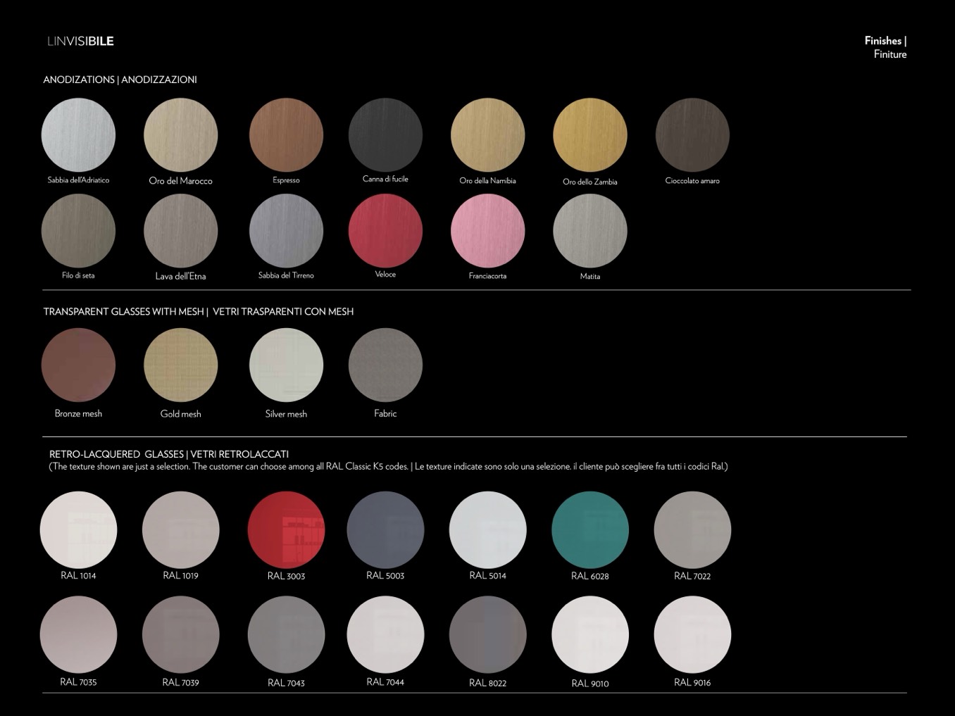 (The texture shown are just a selection. The customer can choose among all RAL Classic K5 codes. | Le texture indicate sono solo una selezione. il cliente può scegliere fra tutti i codici Ral.)