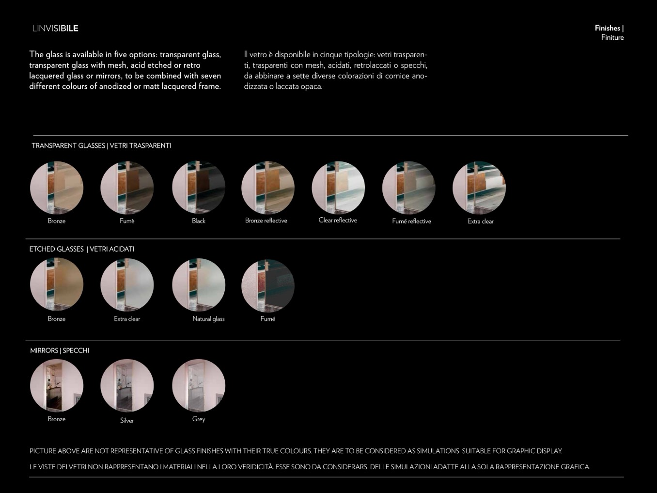 PICTURE ABOVE ARE NOT REPRESENTATIVE OF GLASS FINISHES WITH THEIR TRUE COLOURS. THEY ARE TO BE CONSIDERED AS SIMULATIONS SUITABLE FOR GRAPHIC DISPLAY.