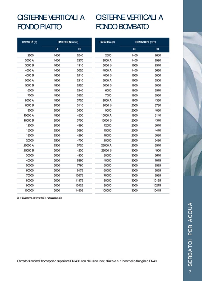 Corredo standard: boccaporto superiore DN 400 con chiusino inox, sfiato e n. 1 bocchello flangiato DN40.