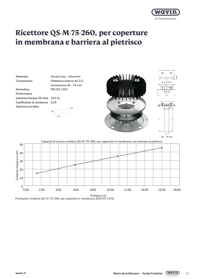 Capacità di scarico ricettore QS-M-75-260, per coperture in membrana, con barriera al pietrisco
