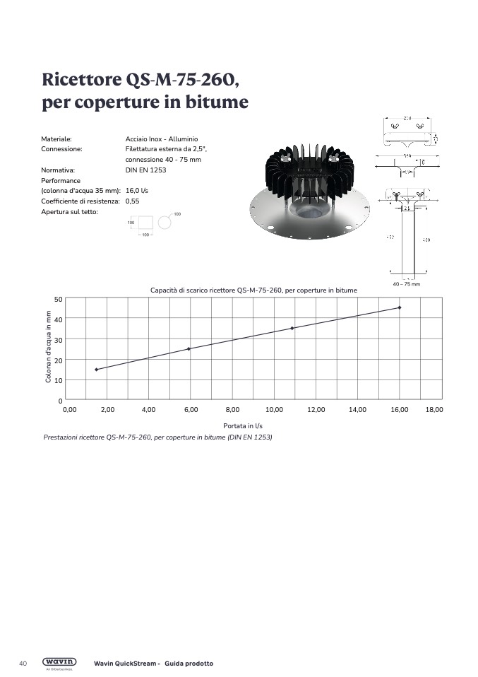 Capacità di scarico ricettore QS-M-75-260, per coperture in bitum
