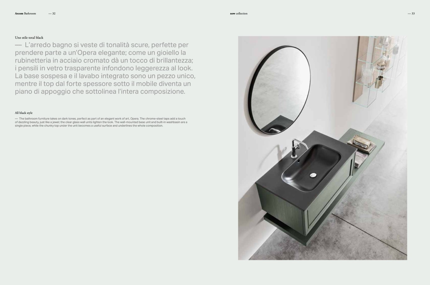 –– The bathroom furniture takes on dark tones, perfect as part of an elegant work of art, Opera. The chrome-steel taps add a touch