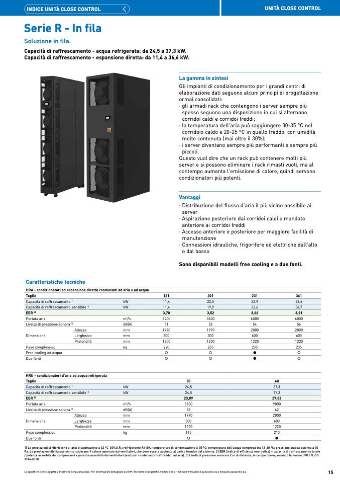 Pa. Le prestazioni dichiarate non considerano il calore generato dai ventilatori, che deve essere aggiunto al carico termico del sistema. 2) EER (indice di efficienza energetica) = capacità di raffrescamento totale