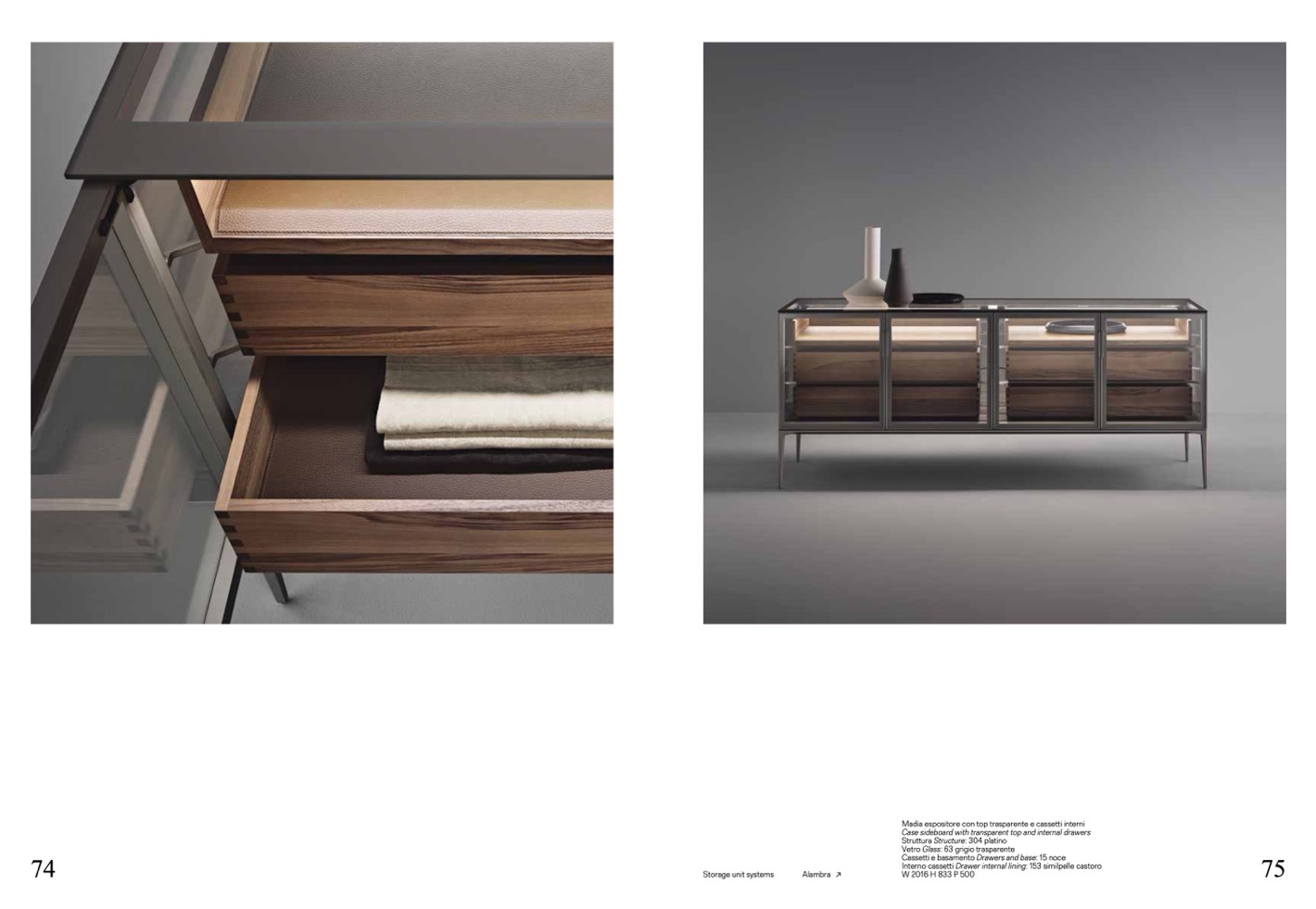 Case sideboard with transparent top and internal drawers