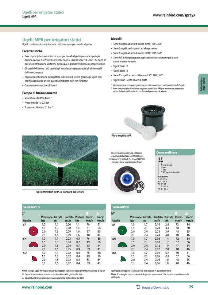 Nota: Tutti gli ugelli MPR sono testati su irrigatori statici con sollevamento del canotto di 10 cm