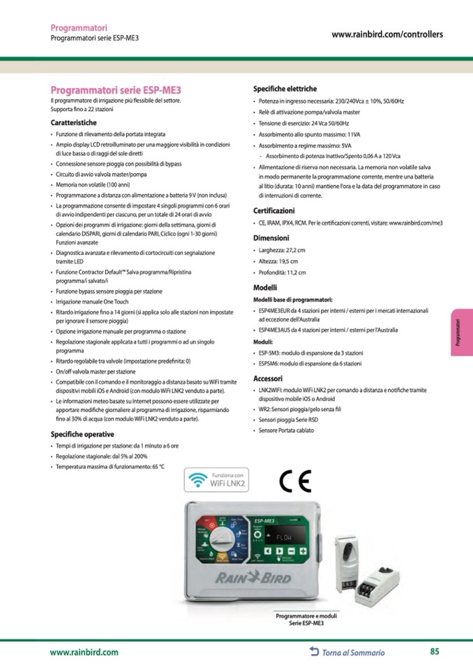 • CE, IRAM, IPX4, RCM. Per le certificazioni correnti, visitare: www.rainbird.com/me3