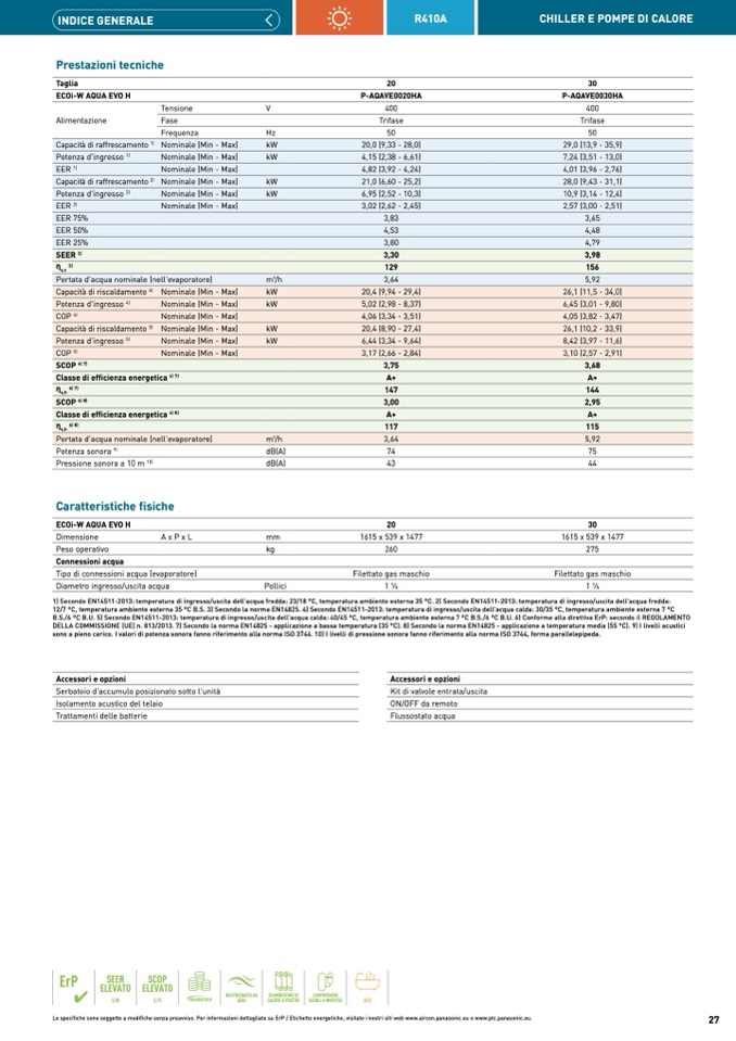 1) Secondo EN14511-2013: temperatura di ingresso/uscita dell'acqua fredda: 23/18 °C, temperatura ambiente esterna 35 °C. 2) Secondo EN14511-2013: temperatura di ingresso/uscita dell'acqua fredda: