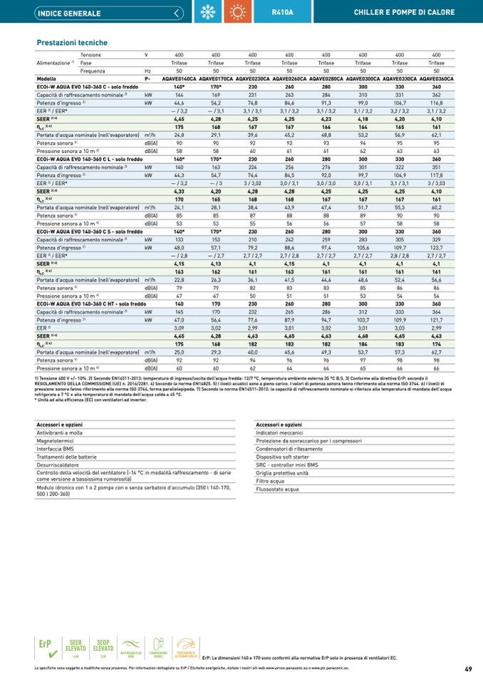 1) Tensione 400 V +/- 10%. 2) Secondo EN14511-2013: temperatura di ingresso/uscita dell'acqua fredda: 12/7 °C, temperatura ambiente esterna 35 °C B.S. 3) Conforme alla direttiva ErP: secondo il