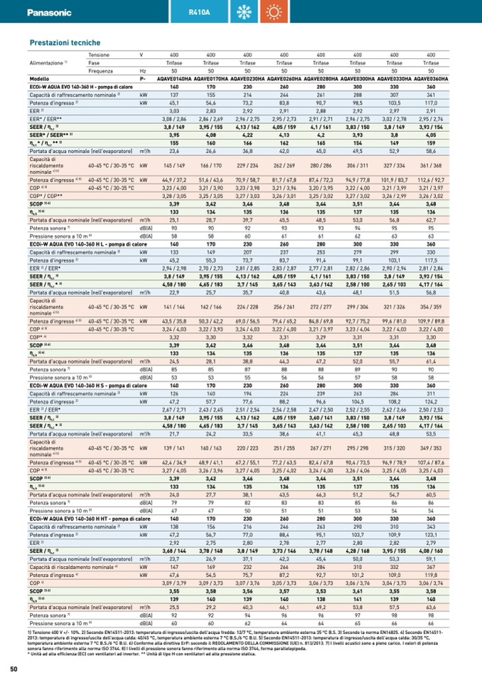 1) Tensione 400 V +/- 10%. 2) Secondo EN14511-2013: temperatura di ingresso/uscita dell'acqua fredda: 12/7 °C, temperatura ambiente esterna 35 °C B.S. 3) Secondo la norma EN14825. 4) Secondo EN14511-