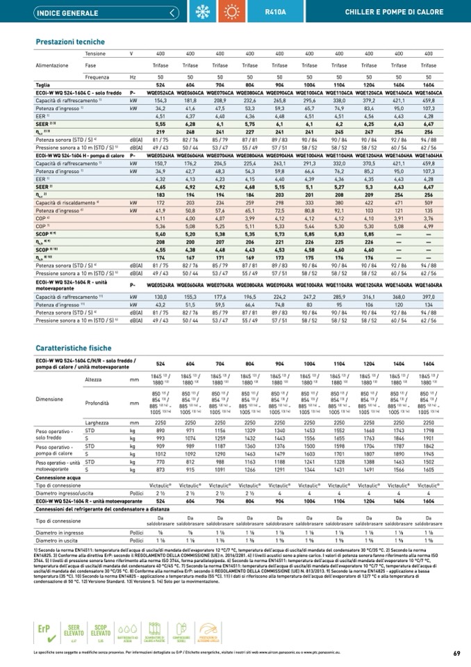 EN14825. 3) Conforme alla direttiva ErP: secondo il REGOLAMENTO DELLA COMMISSIONE (UE) n. 2016/2281. 4) I livelli acustici sono a pieno carico. I valori di potenza sonora fanno riferimento alla norma ISO