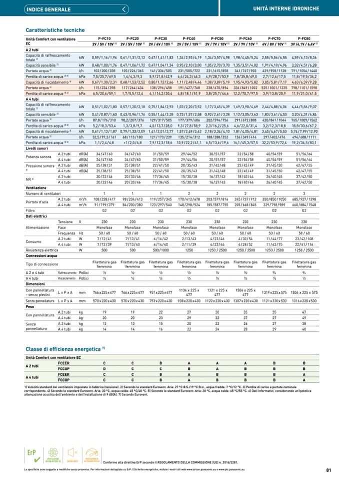 1) Velocità standard del ventilatore impostate in fabbrica (tensione). 2) Secondo lo standard Eurovent. Aria: 27 °C B.S./19 °C B.U., acqua fredda: 7 °C/12 °C. 3) Perdita di carico a portata nominale