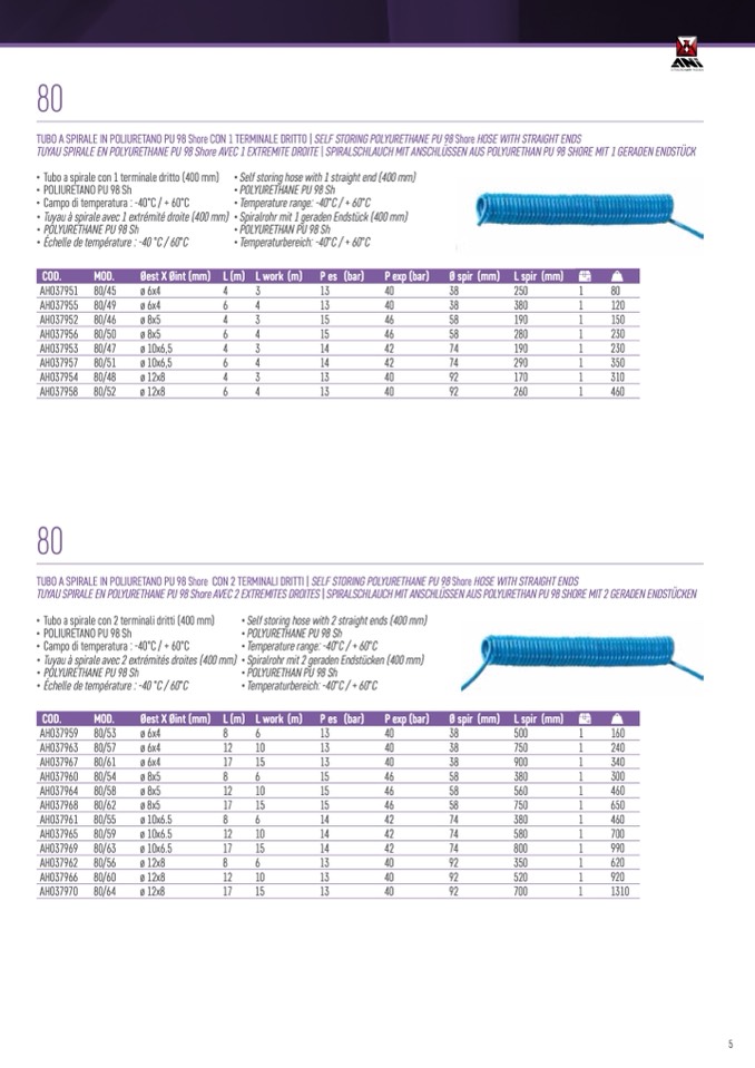 TUBO A SPIRALE IN POLIURETANO PU 98 Shore CON 2 TERMINALI DRITTI | SELF STORING POLYURETHANE PU 98 Shore HOSE WITH STRAIGHT ENDS