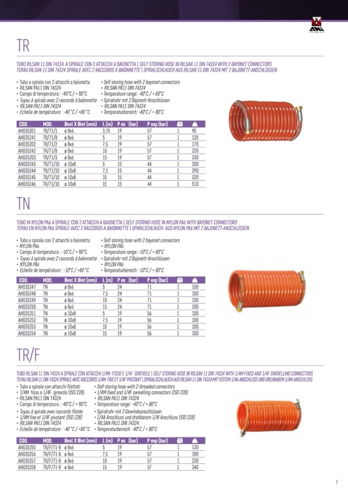 TUBO RILSAN 11 DIN 74324 A SPIRALE CON ATTACCHI 1/4M FISSO E 1/4F GIREVOLE | SELF STORING HOSE IN RILSAN 11 DIN 74324 WITH 1/4M FIXED AND 1/4F SWIVELLING CONNECTORS