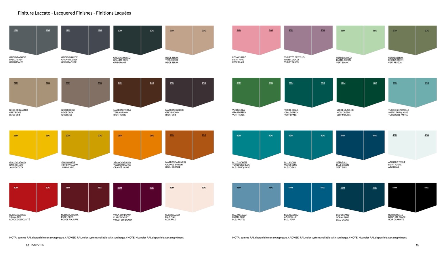 NOTA: gamma RAL disponibile con sovraprezzo. / ADVISE: RAL color system available with surcharge. / NOTE: Nuancier RAL disponible avec supplément.