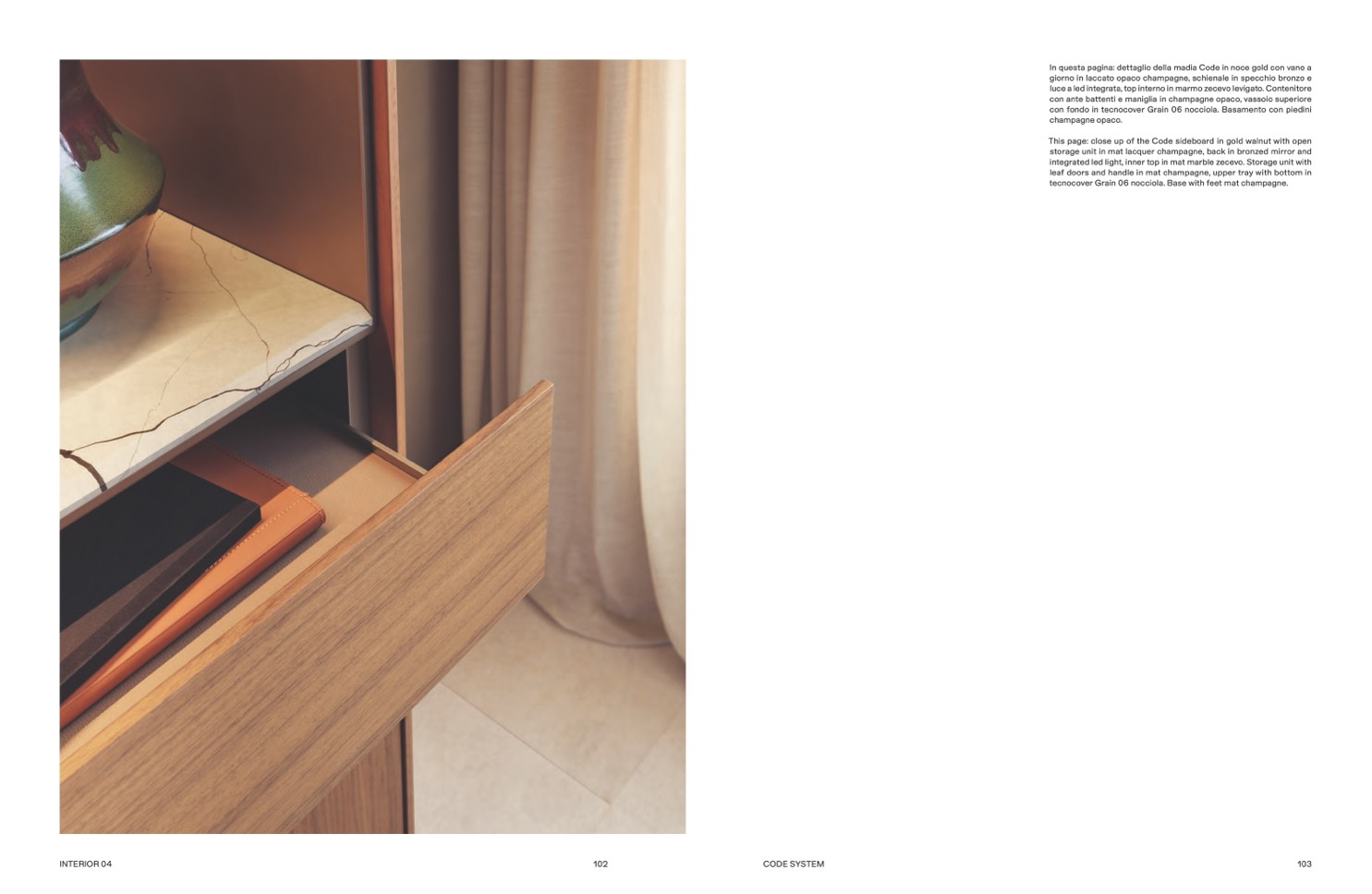 This page: close up of the Code sideboard in gold walnut with open