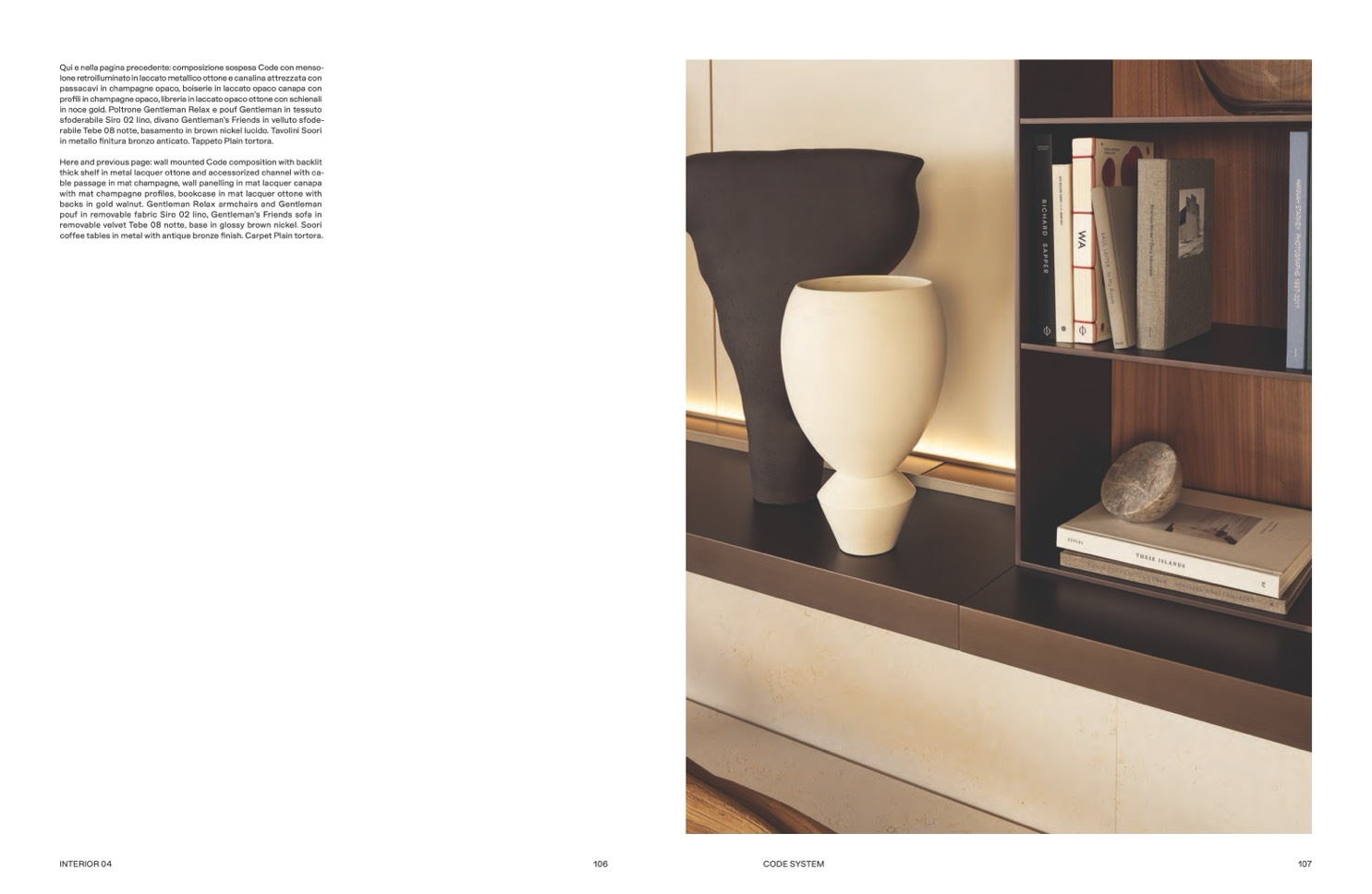 with mat champagne profiles, bookcase in mat lacquer ottone with