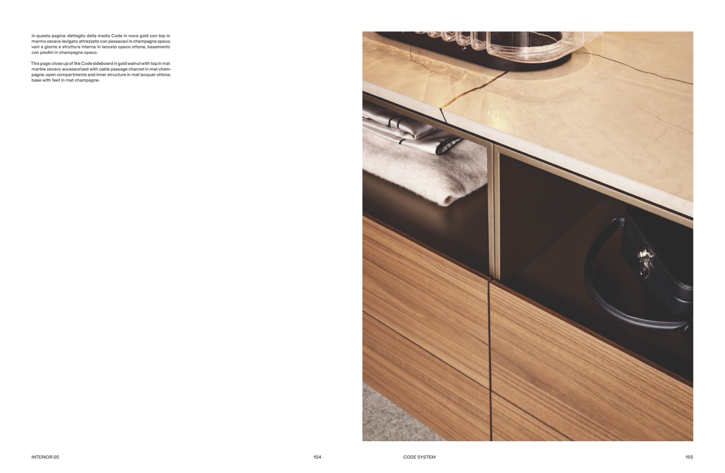 This page: close up of the Code sideboard in gold walnut with top in mat