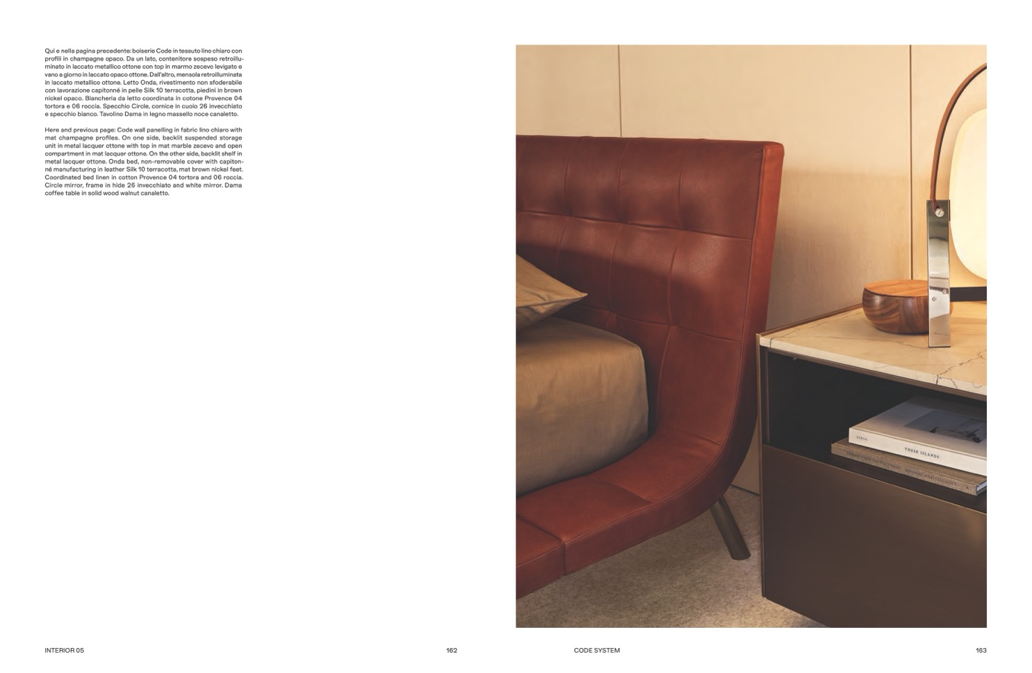 Qui e nella pagina precedente: boiserie Code in tessuto lino chiaro con