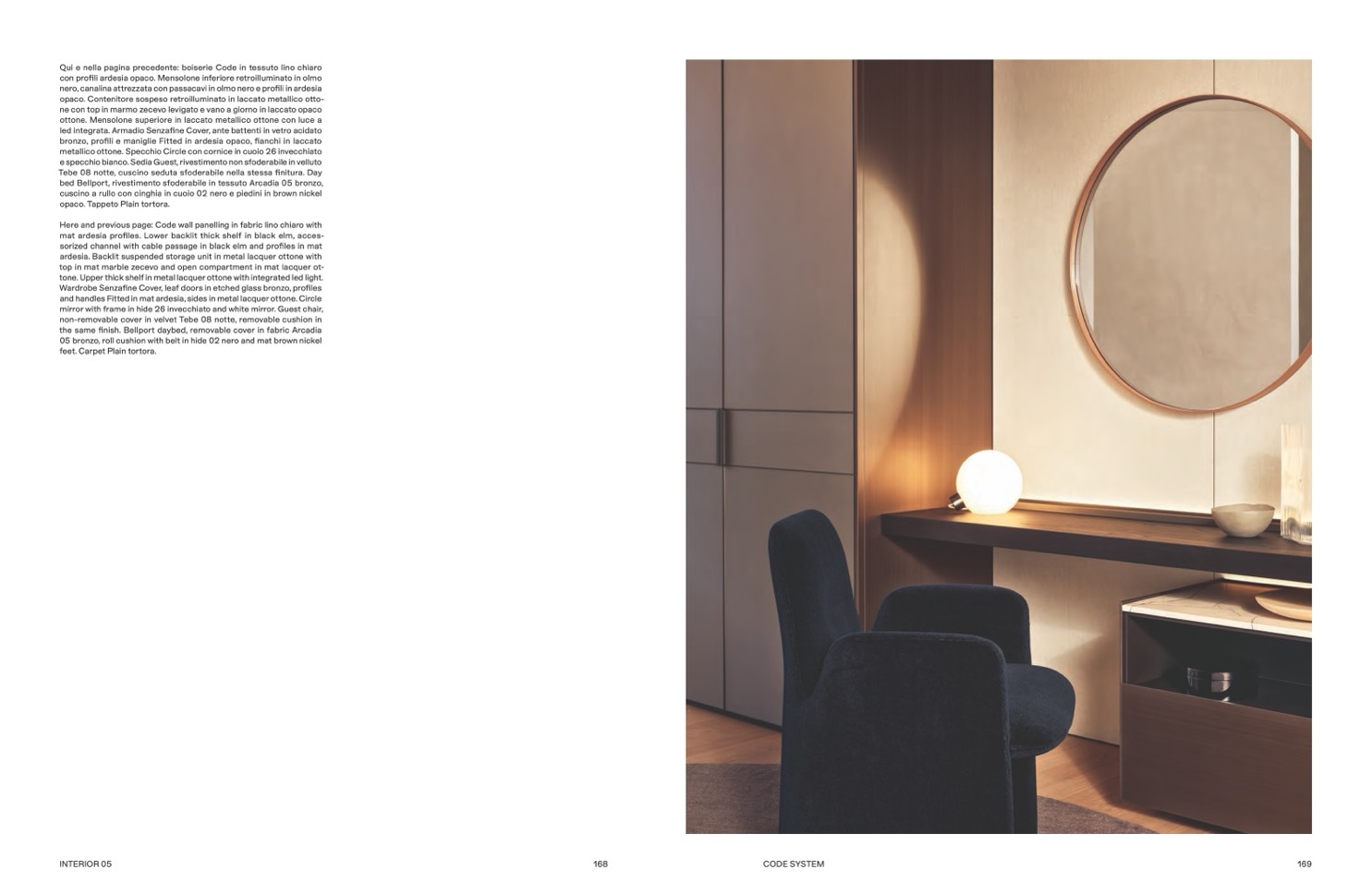 Qui e nella pagina precedente: boiserie Code in tessuto lino chiaro