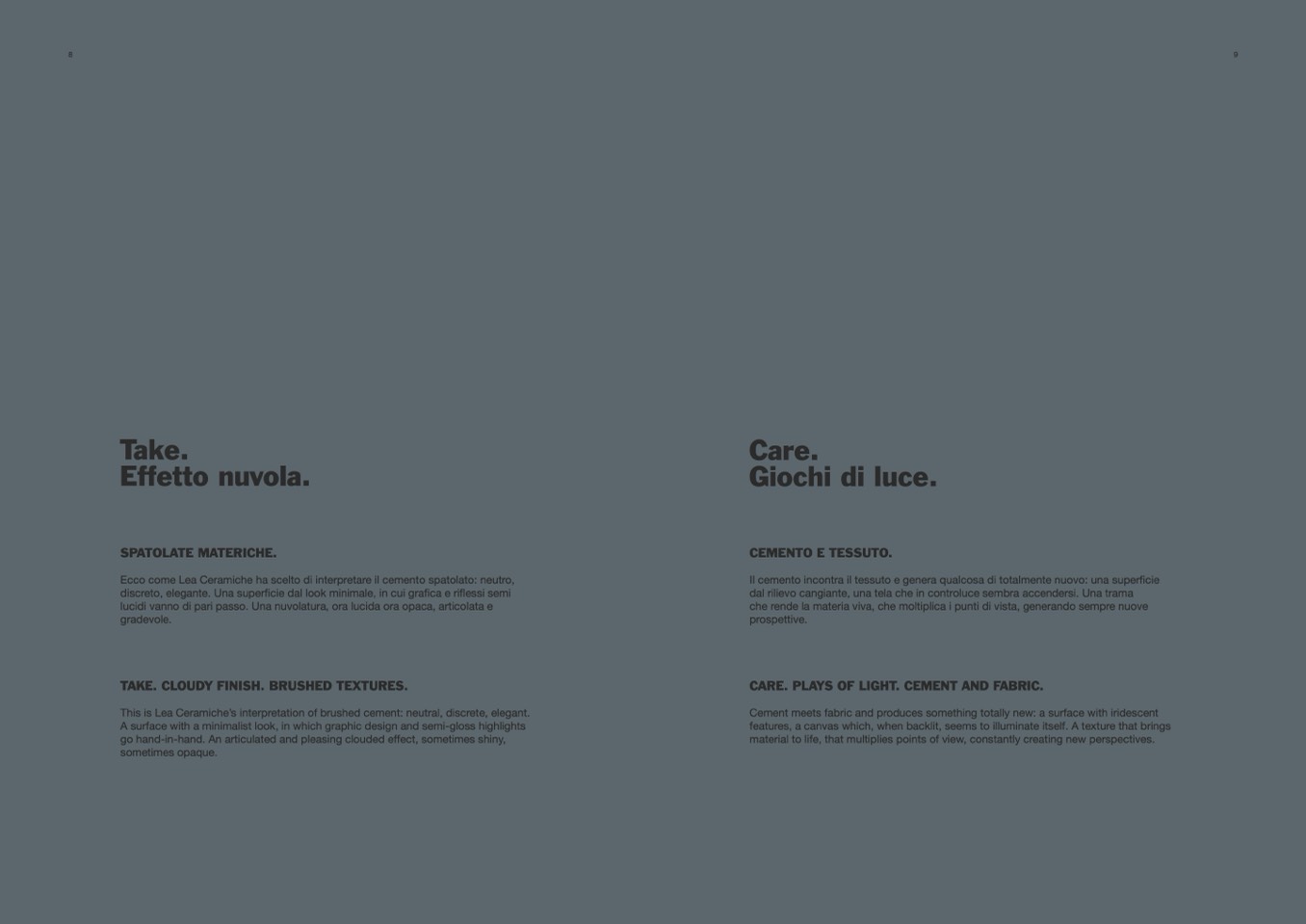 TAKE. CLOUDY FINISH. BRUSHED TEXTURES.