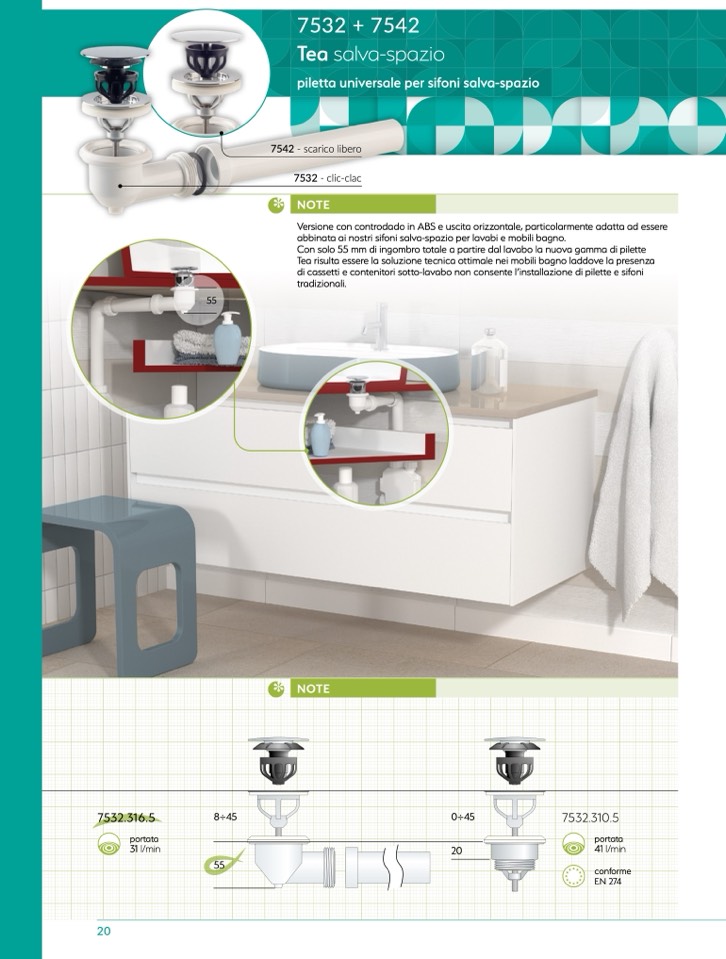 Con solo 55 mm di ingombro totale a partire dal lavabo la nuova gamma di pilette