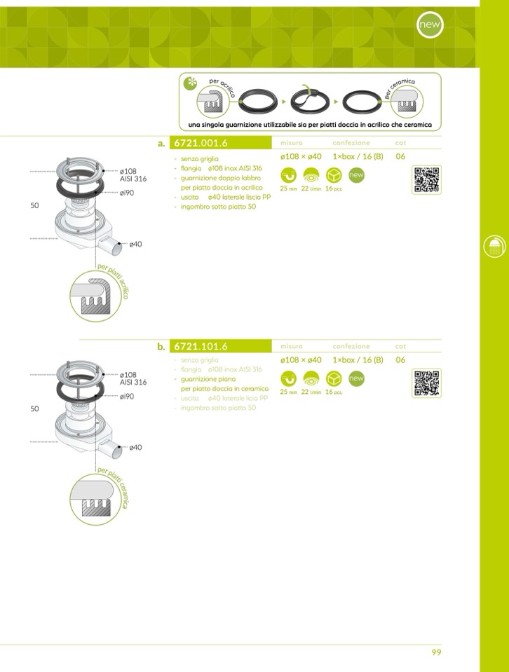 una singola guarnizione utilizzabile sia per piatti doccia in acrilico che ceramic