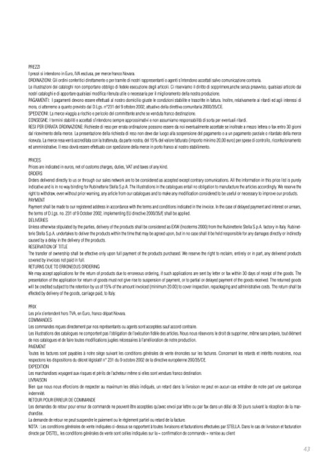 Unless otherwise stipulated by the parties, delivery of the products shall be considered as EXW (Incoterms 2000) from the Rubinetterie Stella S.p.A. factory in Italy. Rubinet-