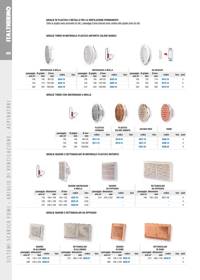 Tutte le griglie sono provviste di reti, i passaggi d'aria indicati sono relativi alle griglie prive di reti.