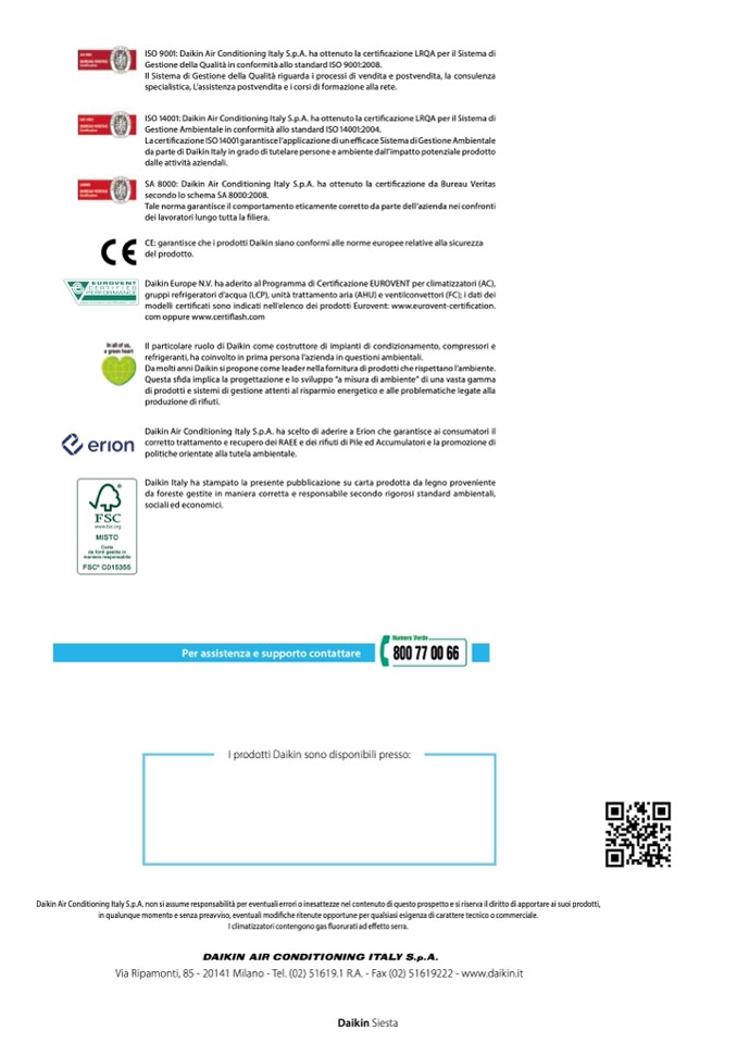 Daikin Air Conditioning Italy S.p.A. non si assume responsabilità per eventuali errori o inesattezze nel contenuto di questo prospetto e si riserva il diritto di apportare ai suoi prodotti,
