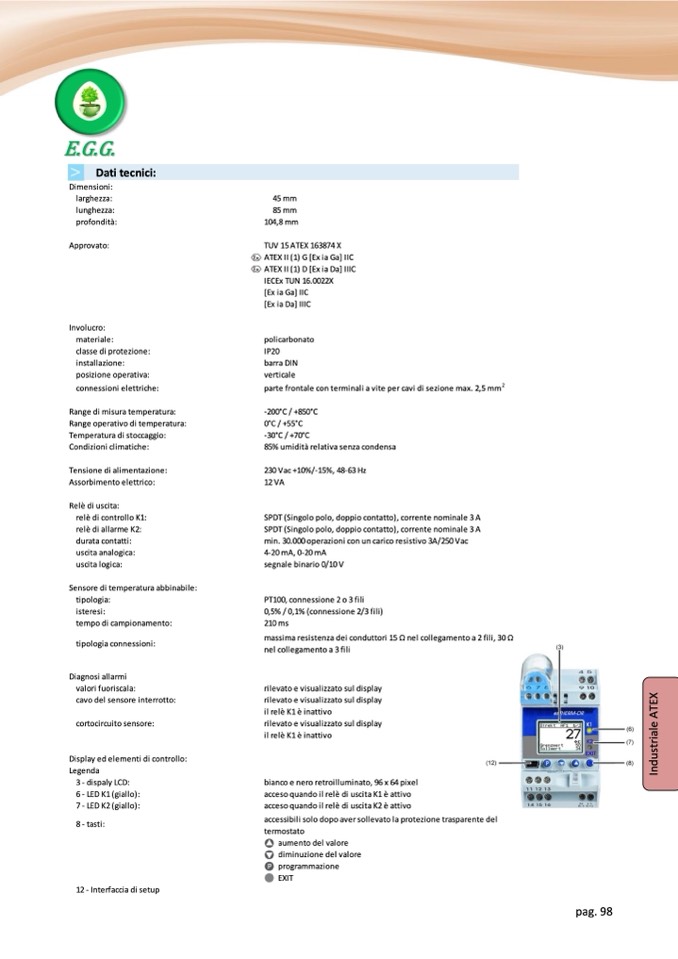 e frontale con terminali a vite per cavi di sezione max. 2,5 mm