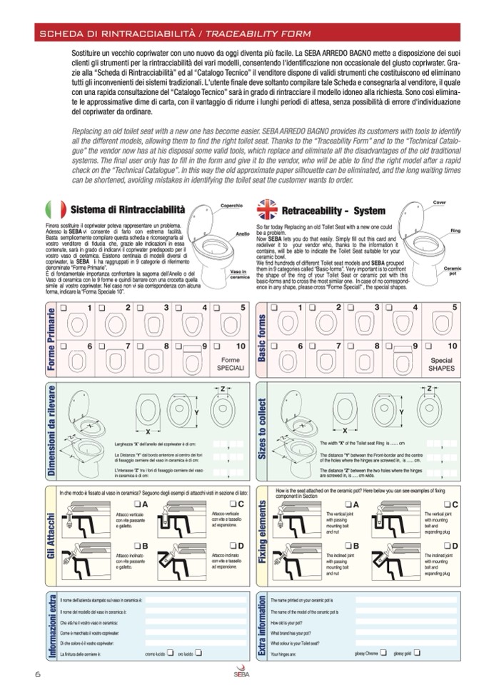 all the different models, allowing them to find the right toilet seat. Thanks to the “Traceability Form” and to the “Technical Catalo-