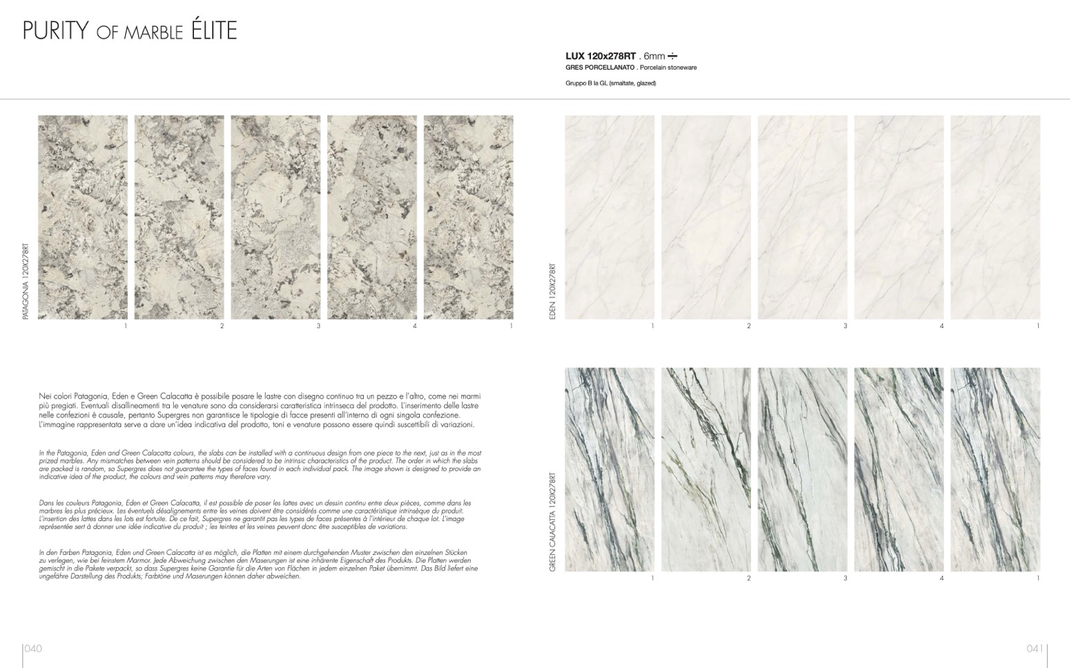 In the Patagonia, Eden and Green Calacatta colours, the slabs can be installed with a continuous design from one piece to the next, just as in the most