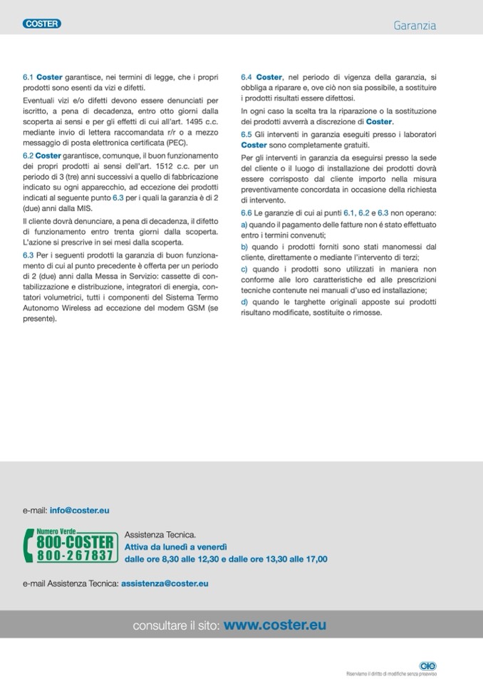 6.2 Coster garantisce, comunque, il buon funzionamento