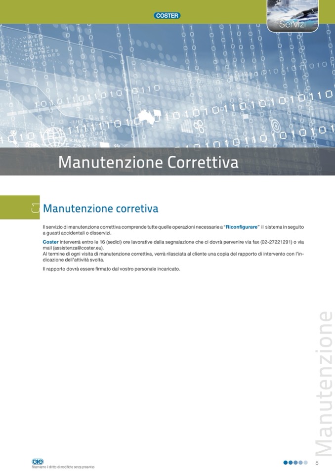 Al termine di ogni visita di manutenzione correttiva, verrà rilasciata al cliente una copia del rapporto di intervento con l’in-