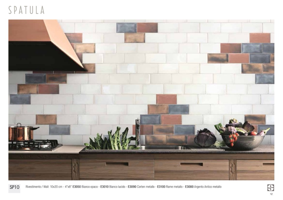 Rivestimento / Wall: 10x20 cm - 4”x8” E3050 Bianco opaco - E3010 Bianco lucido - E3090 Corten metallo - E3100 Rame metallo - E3080 Argento Antico metallo