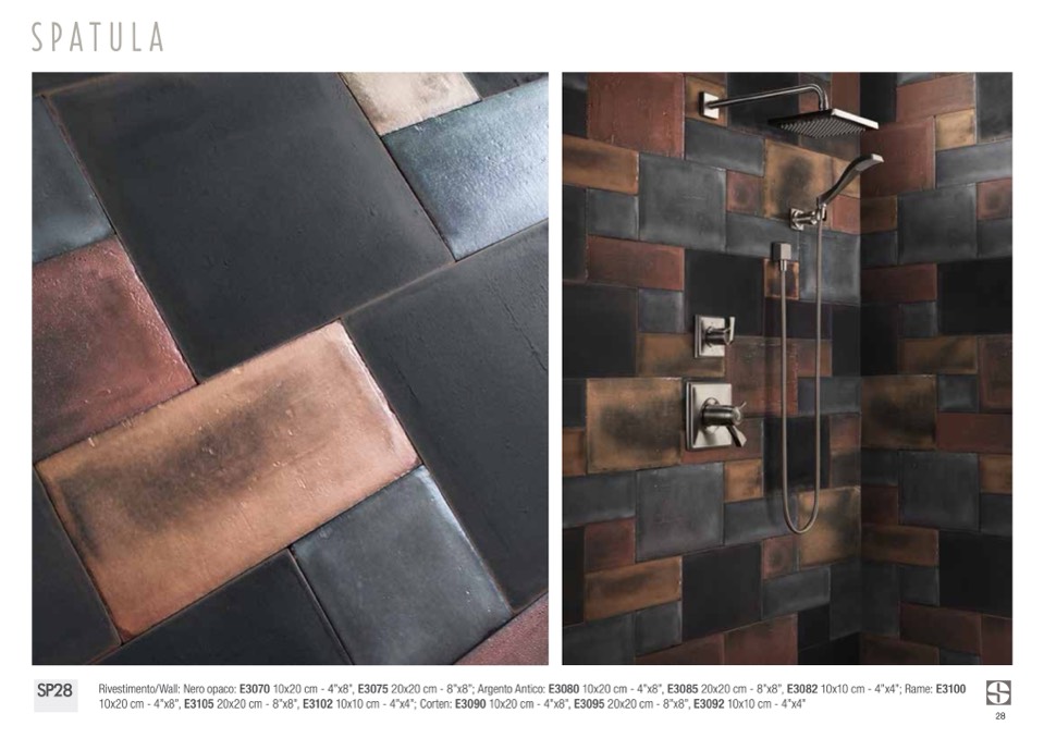 Rivestimento/Wall: Nero opaco: E3070 10x20 cm - 4”x8”, E3075 20x20 cm - 8”x8”; Argento Antico: E3080 10x20 cm - 4”x8”, E3085 20x20 cm - 8”x8”, E3082 10x10 cm - 4”x4”; Rame: E3100