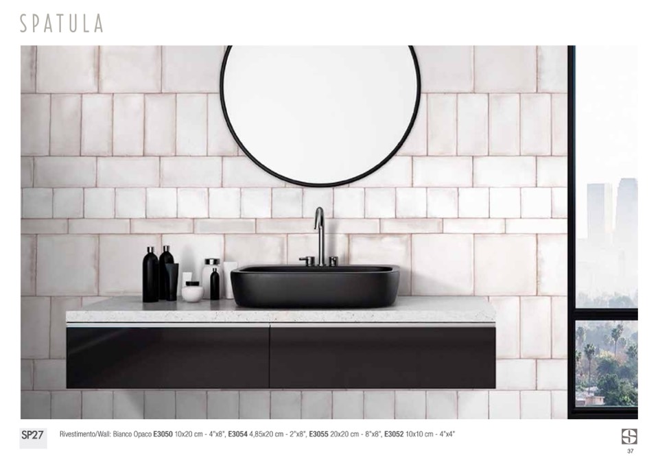 Rivestimento/Wall: Bianco Opaco E3050 10x20 cm - 4”x8”, E3054 4,85x20 cm - 2”x8”, E3055 20x20 cm - 8”x8”, E3052 10x10 cm - 4”x4”