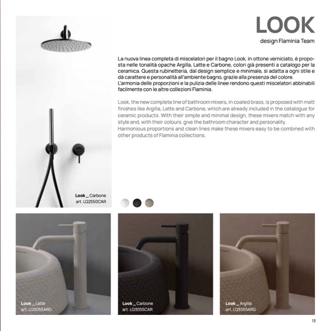 La nuova linea completa di miscelatori per il bagno Look, in ottone verniciato, è propo-