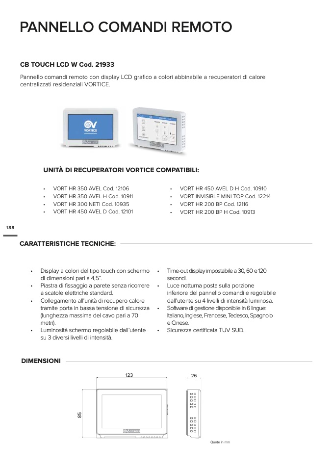 Pannello comandi remoto con display LCD grafico a colori abbinabile a recuperatori di calore