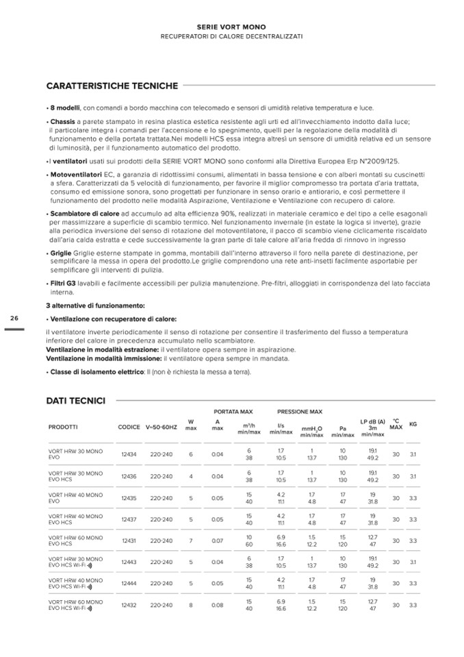 •I ventilatori usati sui prodotti della SERIE VORT MONO sono conformi alla Direttiva Europea Erp N°2009/125.