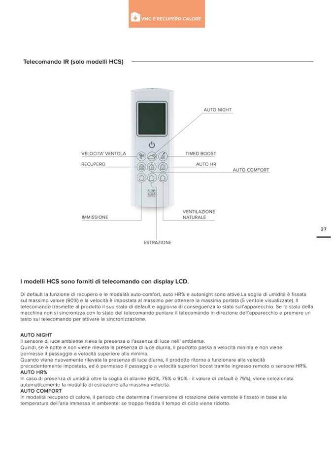 Di default la funzione di recupero e le modalità auto-comfort, auto HR% e autonight sono attive.La soglia di umidità è fissata